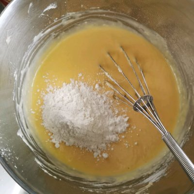 8、低粉過篩加入到乳酪糊中,攪拌均勻,z字形攪拌