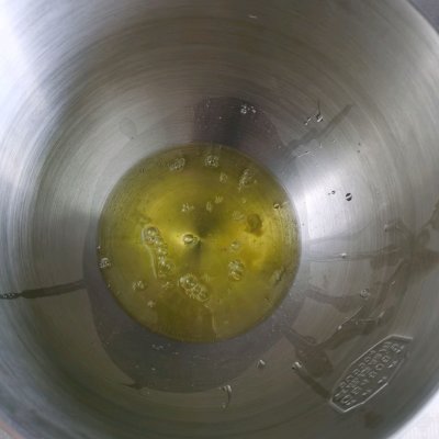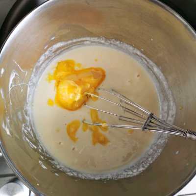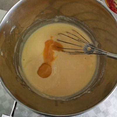 7、六個蛋黃分三次加入,每次加入兩個攪拌均勻之後,再加入兩個,以此類推至攪拌均勻為止