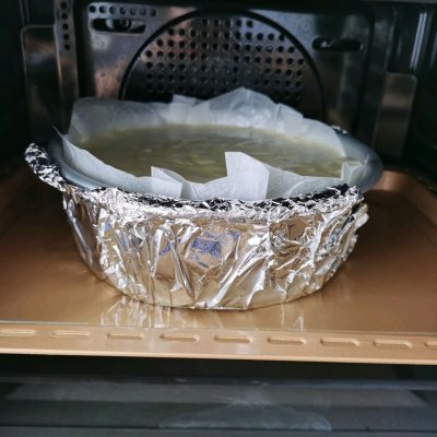 11、打發好的蛋清取1/3,倒入蛋黃當中,z字形攪拌均勻,最後攪拌好的蛋黃糊倒入蛋白中,繼續z行攪拌到均勻。 模具外層包好錫紙,裡面用油紙鋪墊好,攪拌好的糊糊倒入模具當中,然後震幾下震出氣泡。 烤盤當中注入一些熱水,用水浴法來烤,中層放入烤箱當中。