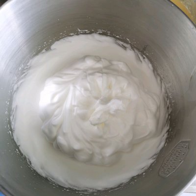 9、蛋清加入檸檬汁,分次加入白糖,打發到溼性發泡即可