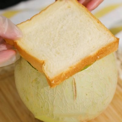 3、在挖空的哈密瓜底部先鋪一片吐司