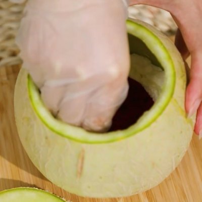 2、首先將哈密瓜洗淨,頂部切開挖空裡面的果肉