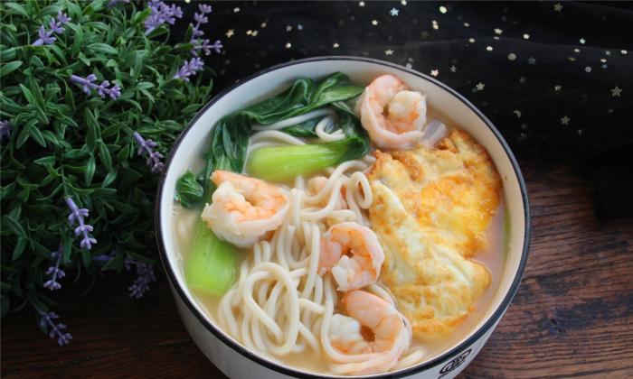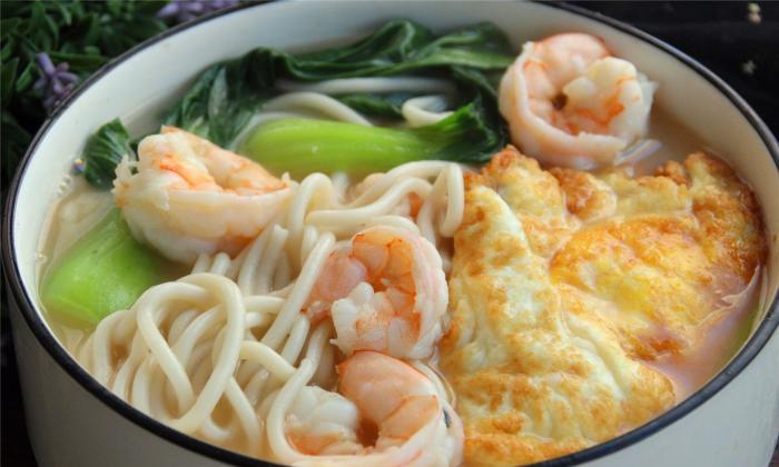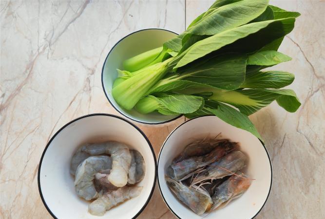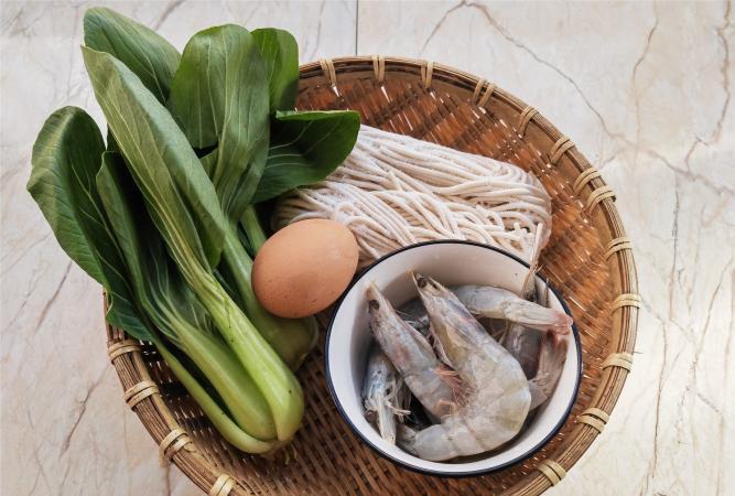所需材料:鮮麵條150克、大蝦6-7個、雞蛋1個、油菜2棵、油鹽適量、蔥1段、姜2片、白胡椒粉1茶匙、雞精1茶匙、料酒半湯匙、